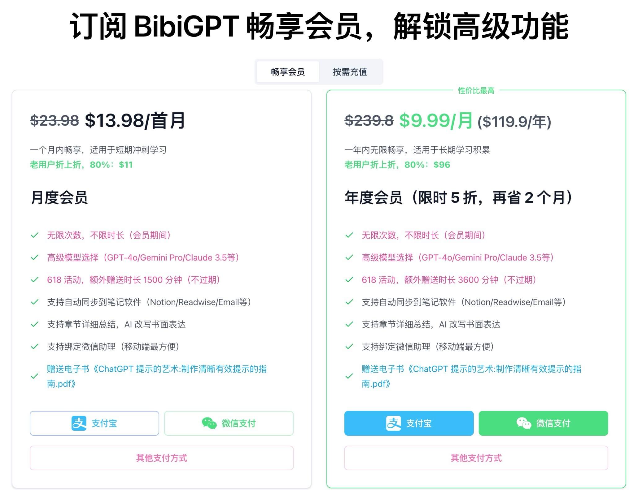 Both tiers unlock unlimited summaries, premium models (GPT-4o, Gemini Pro, Claude 3.5, and more), automated exports to Notion/Readwise/Obsidian/Flomo/Siyuan/Feishu/email, detailed chapter breakdowns, AI rewrites, WeChat assistant binding, and a bonus eBook “The Art of Clear Prompting.”