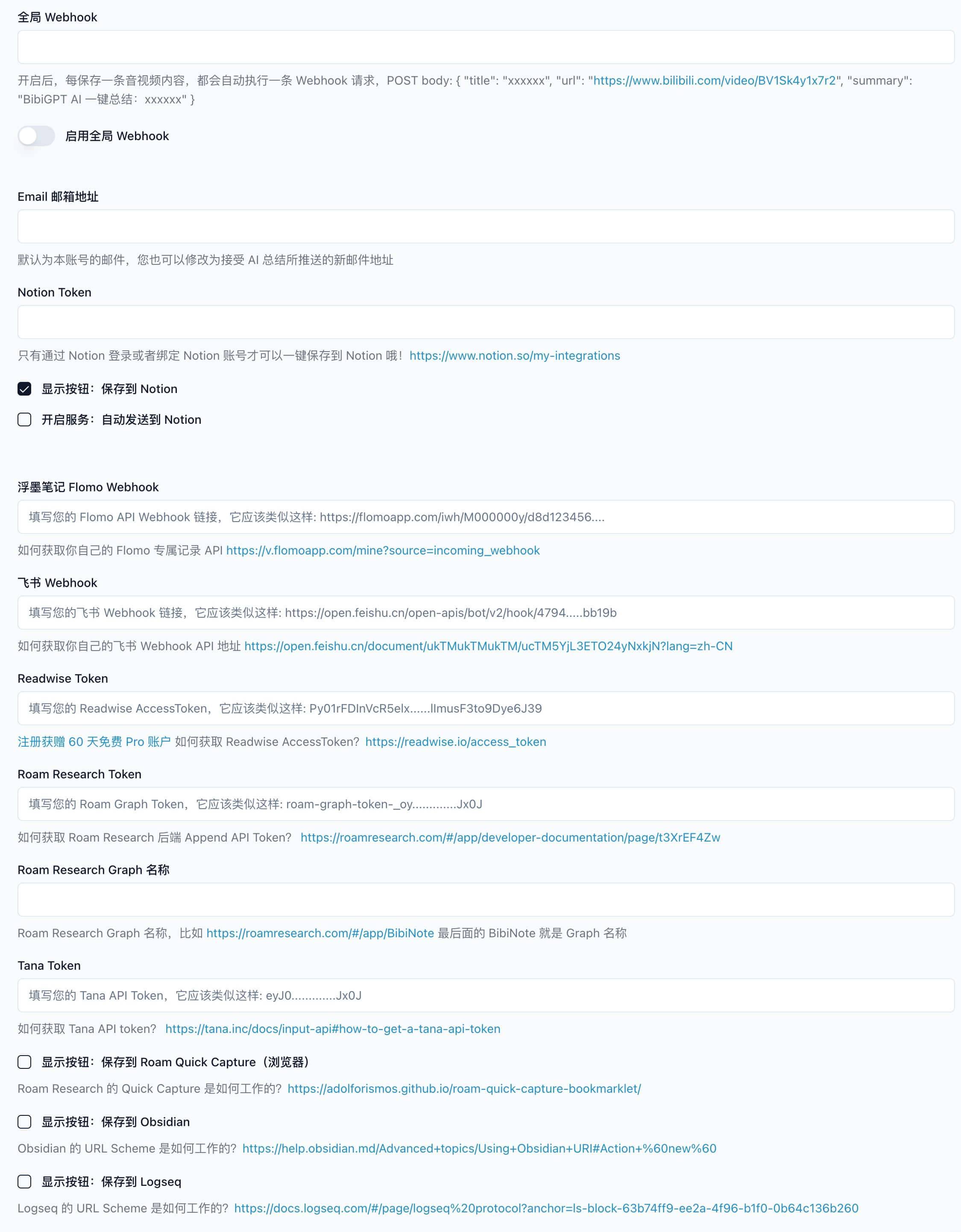 Email · Notion · Flomo · Feishu · Readwise · Roam Research · Roam Quick Capture · Tana · Obsidian · Logseq