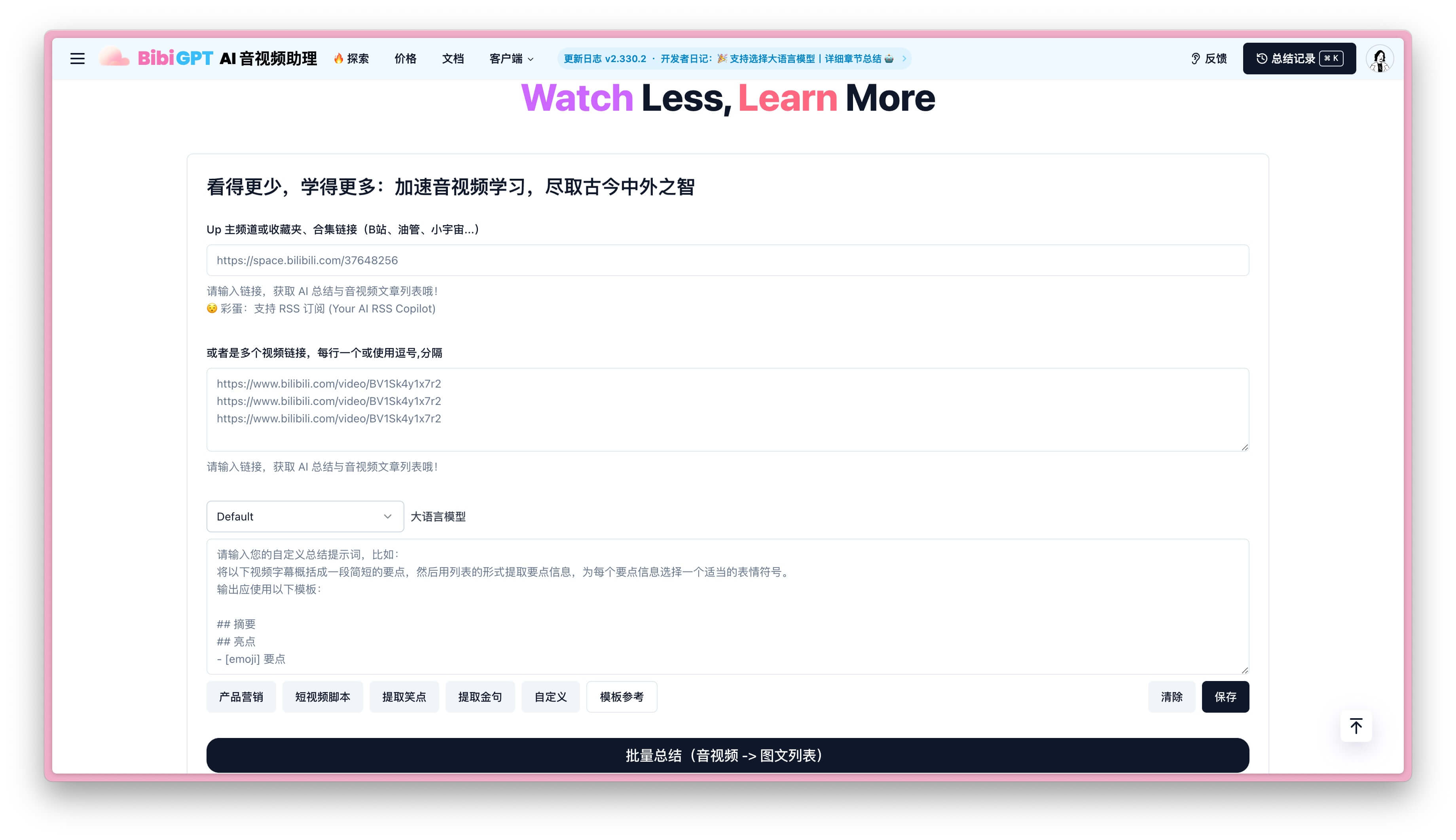 BibiGPT Weekly Update · August 2, 2024 – Batch Summaries, ⌘J Shortcut, UI Refresh