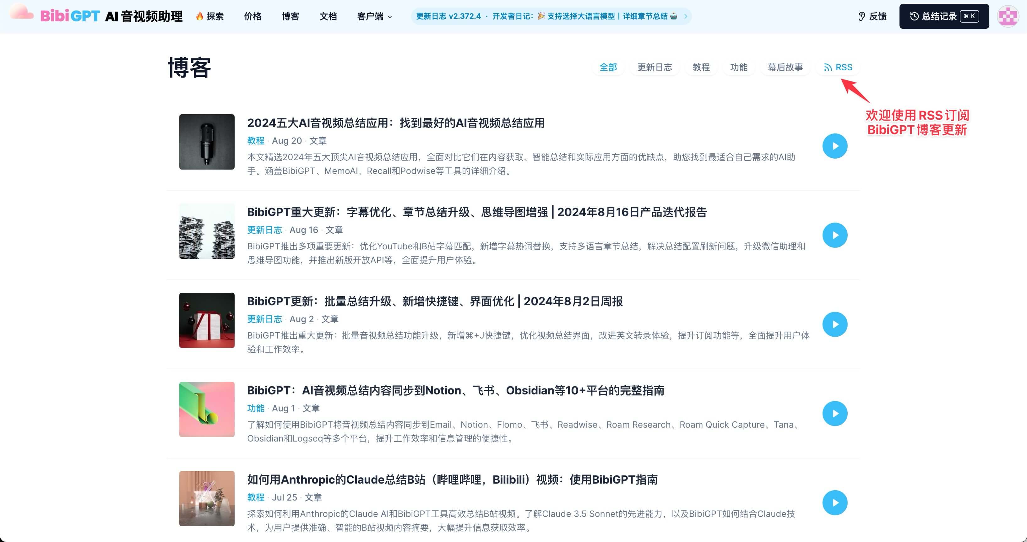 - Blog list page at bibigpt.co/blog/posts catalogs every changelog, tutorial, and promotion. Subscribe via RSS to stay current.