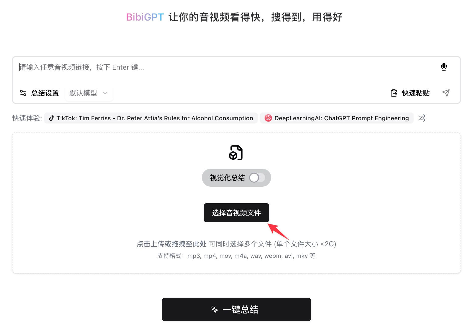 - Select Local Upload: Find the option to select audio-video files in BibiGPT.