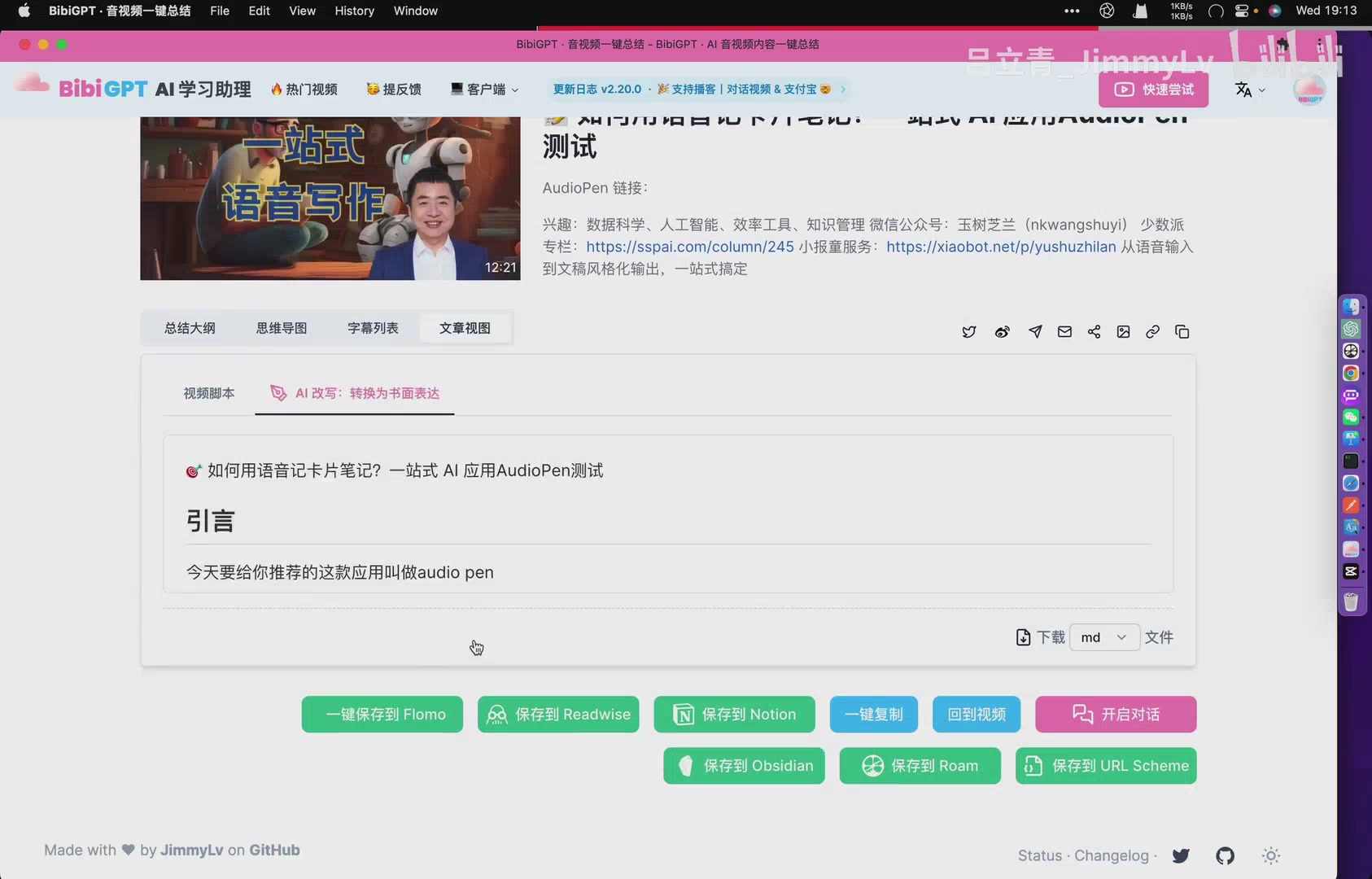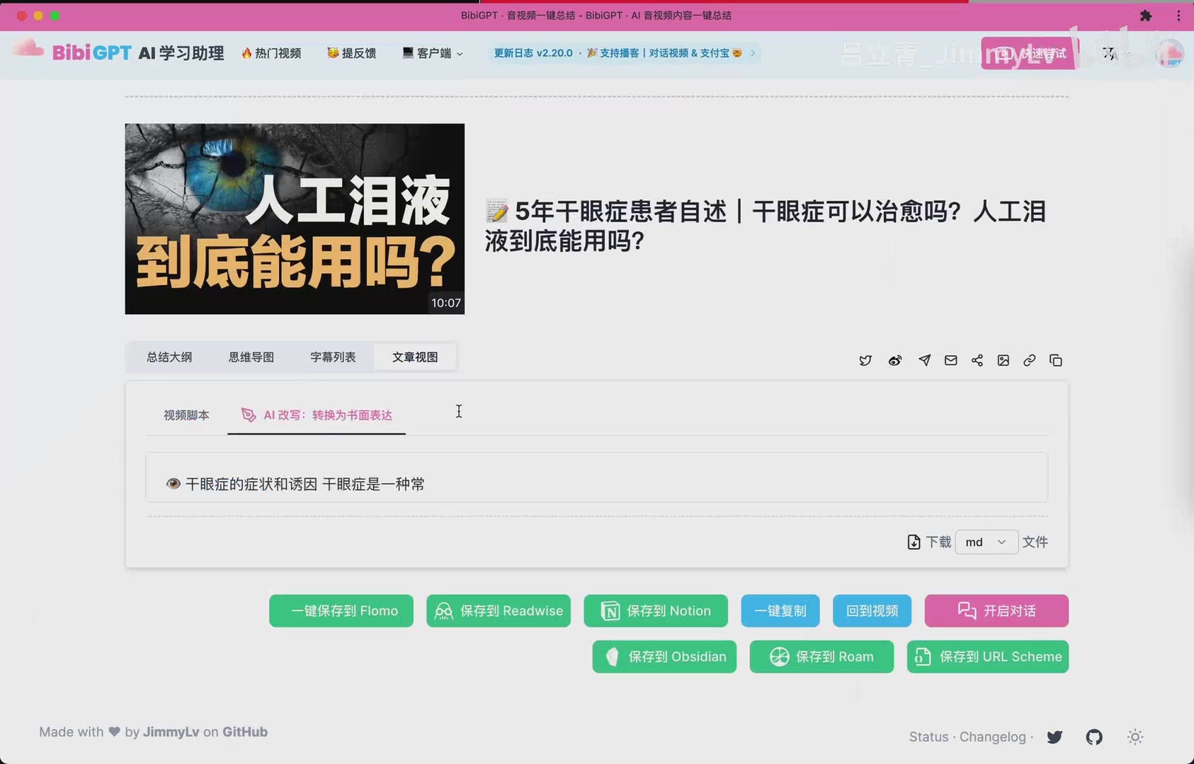 Another theme that aged well: summaries are only valuable when they become part of your knowledge base. Even in the early build, the footer offered quick actions to save to Flomo, Readwise, Notion, or simply copy everything into another app.