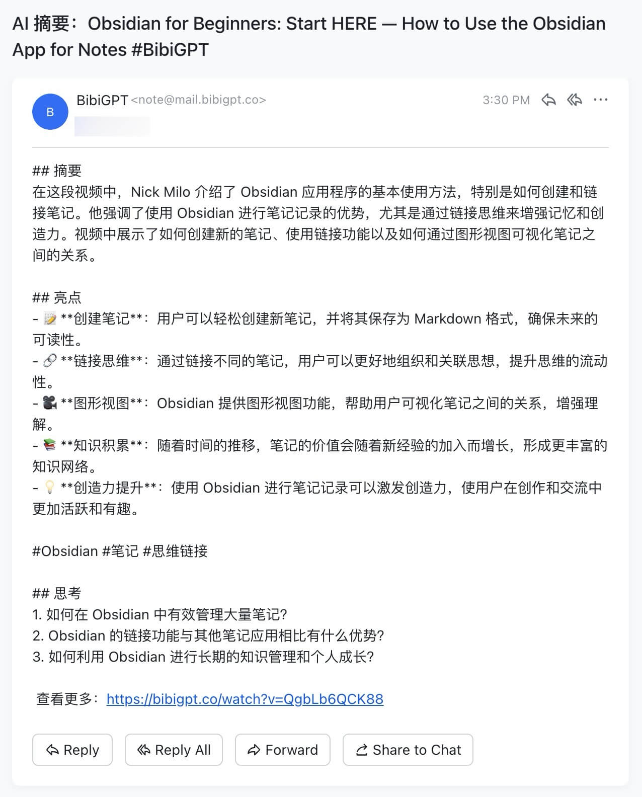 经过以上步骤配置后,每次BibiGPT完成音视频总结时,相关内容将自动发送到您指定的邮箱。这一功能不仅提高了工作效率,还确保您能够随时随地获取重要信息,助力您的学习和工作。
