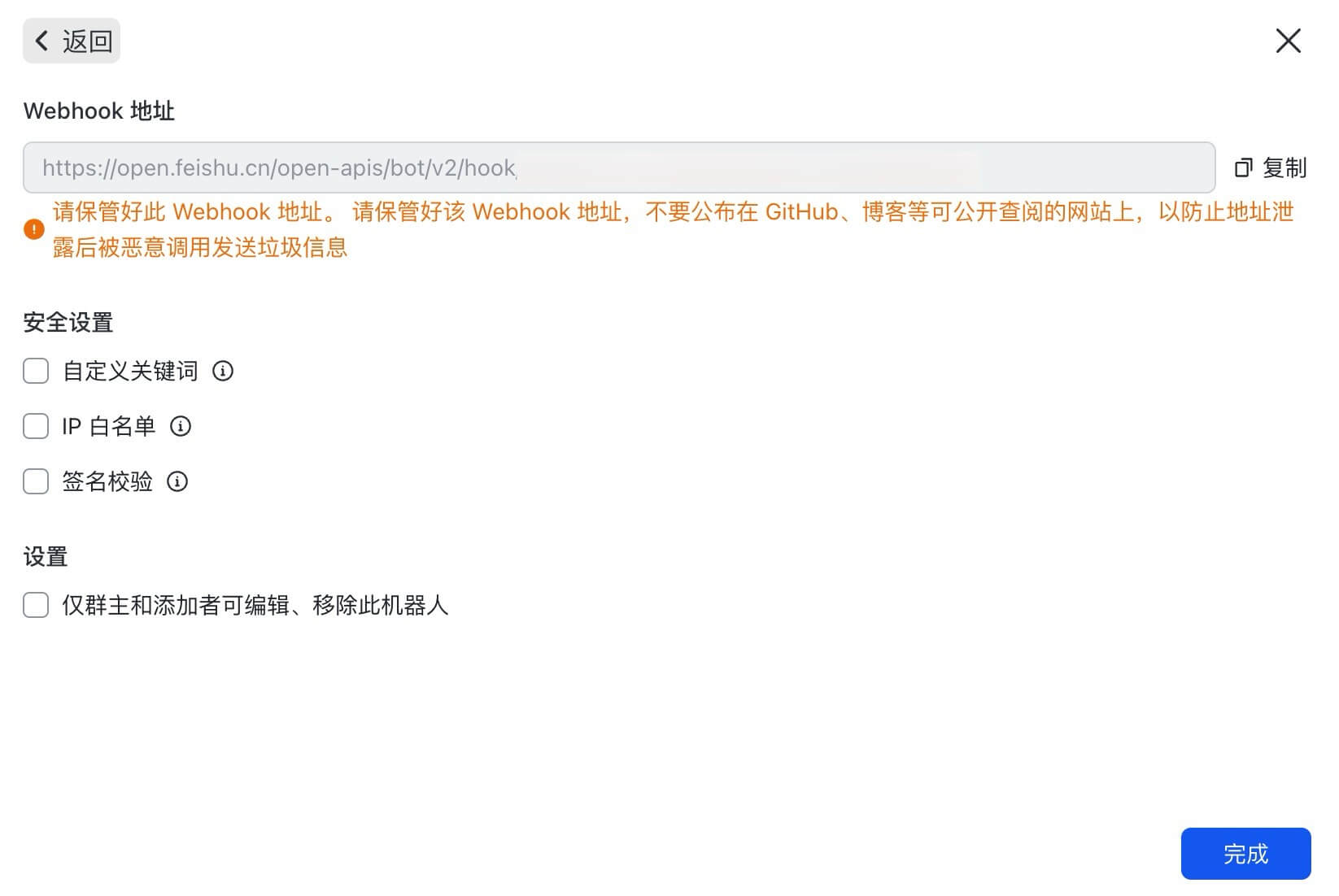 - 获取Webhook地址:点击飞书 Webhook配置项下方的链接,访问自定义机器人使用指南 - 开发指南 - 开发文档 - 飞书开放平台。在页面中,您将找到如何在群组中添加自定义机器人并获取Webhook地址的详细步骤。