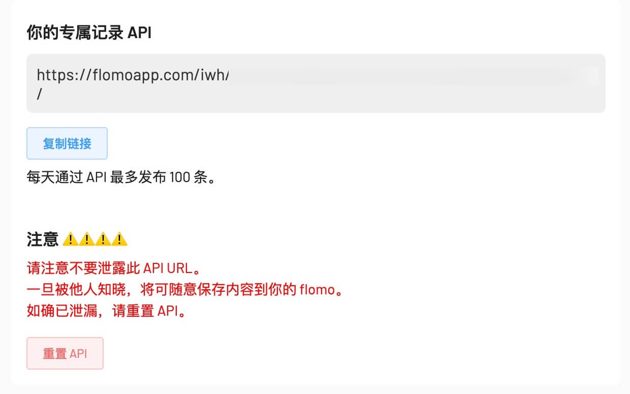 - 复制专属记录API:在浮墨笔记 Flomo Webhook配置项下,点击链接以访问Flomo的专属记录API页面:Flomo专属记录API链接。在页面中,找到并点击“复制链接”按钮,以获取您的专属记录API。