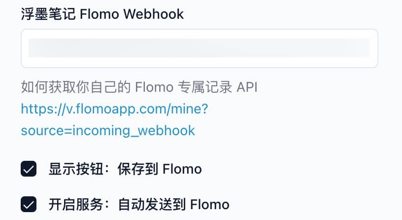 粘贴API并配置选项:返回BibiGPT的账号绑定页面,将刚刚复制的专属记录API粘贴到浮墨笔记 Flomo Webhook的配置输入框内。随后,根据需要,选择是否开启“保存到 Flomo”或“自动发送到 Flomo”功能。前者允许您在生成AI总结后手动保存到Flomo,后者则会自动将总结发送至Flomo。