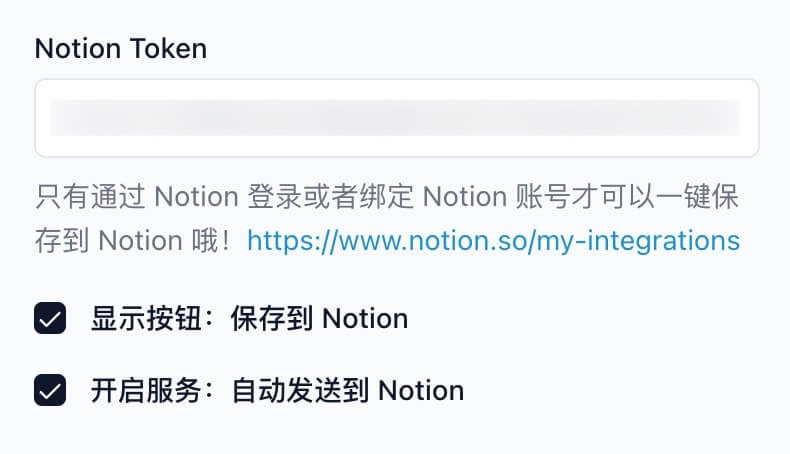 选择功能选项:在完成Token粘贴后,您可以根据需求选择是否开启“显示按钮:保存到 Notion”或“开启服务:自动发送到 Notion”功能。前者允许您在生成AI总结后手动保存到Notion,后者则会自动将总结发送至Notion。