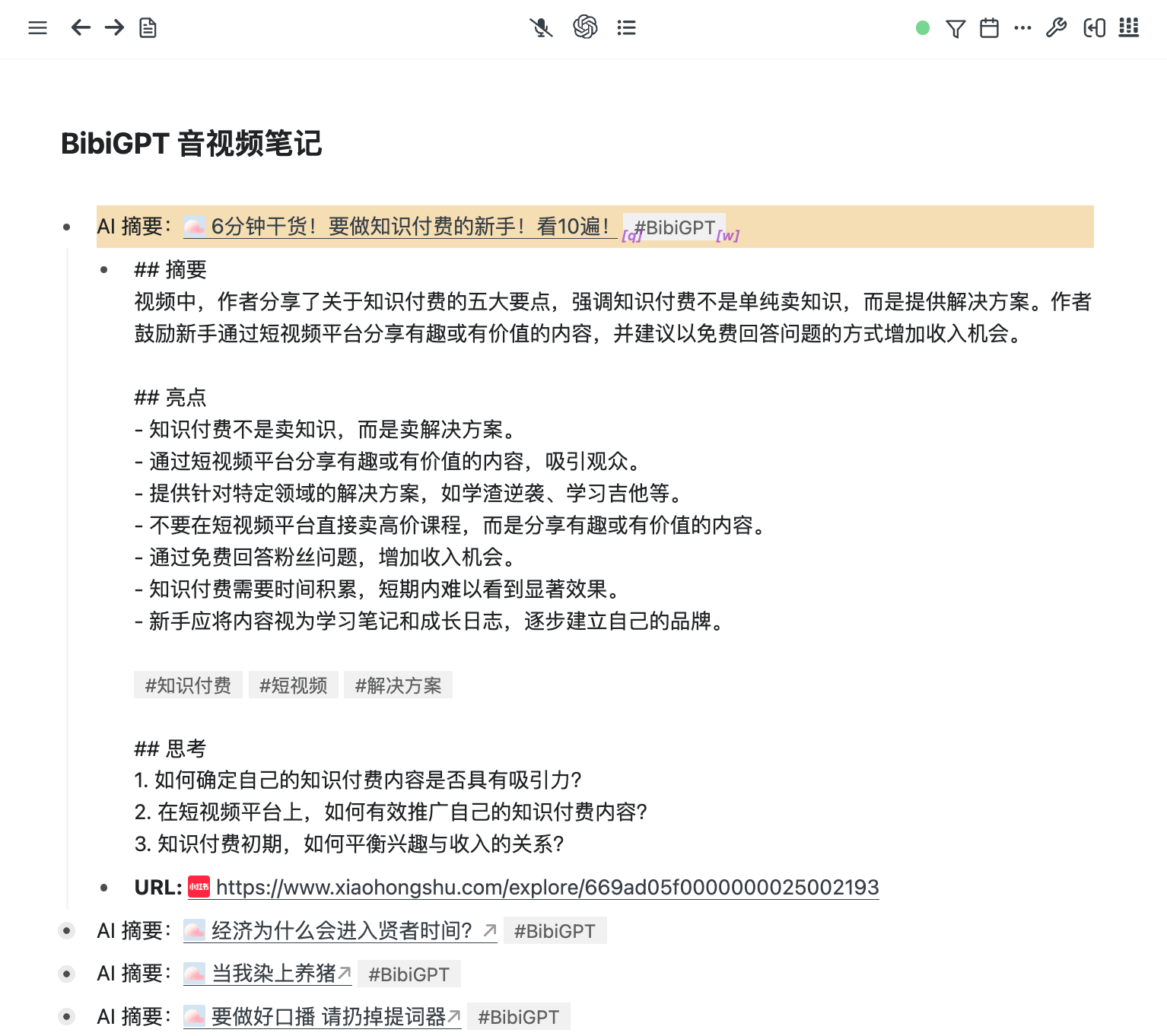 提升工作和学习效率:无论您是在工作中需要与团队协作,还是在个人学习中需要高效管理知识,BibiGPT的多平台同步功能都能显著提升效率。例如,Notion和飞书适用于团队协作,而Readwise和Obsidian则更适合个人知识管理。