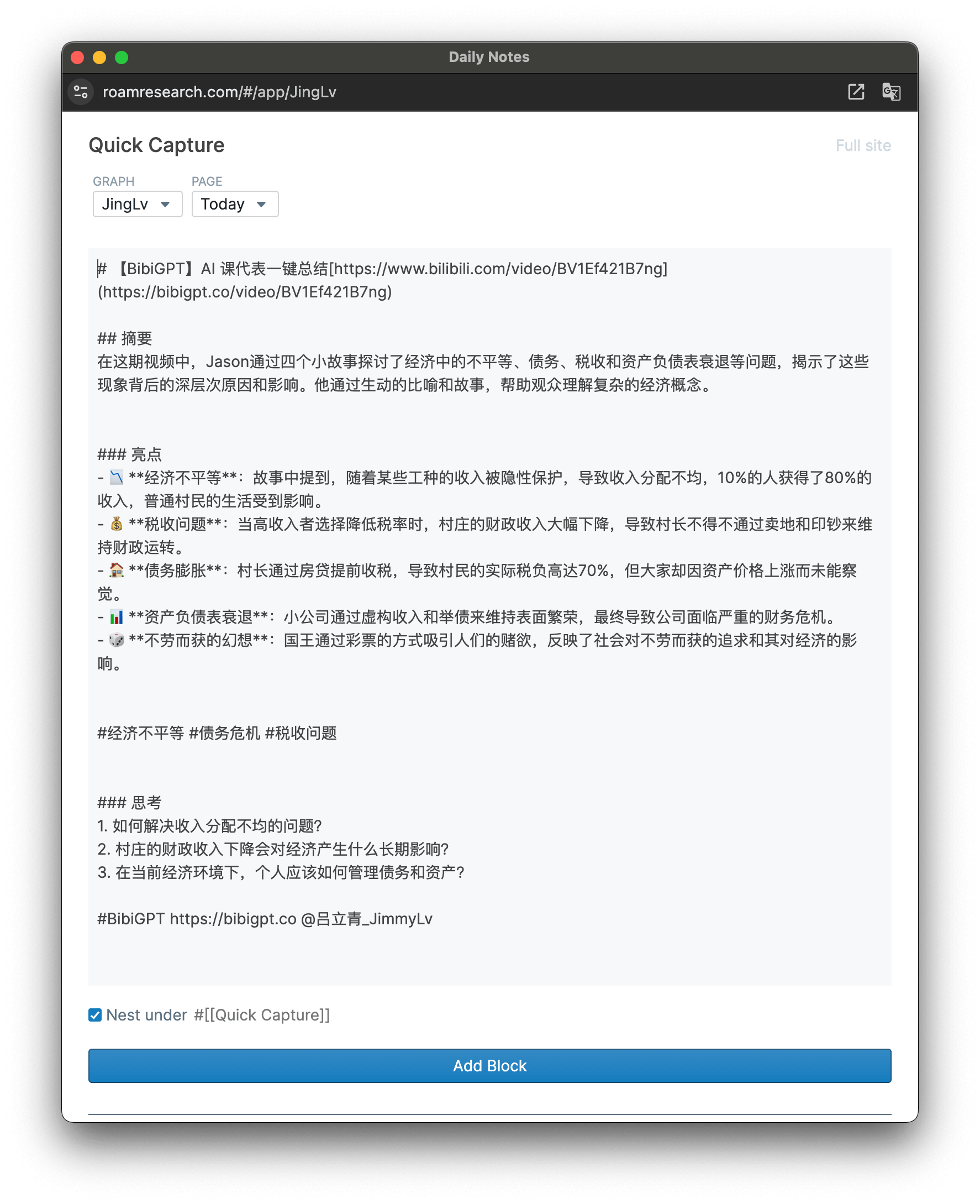 通过以上步骤,您将能够高效地将BibiGPT生成的音视频总结保存至Roam Research,方便您进行后续的知识整理和管理,提升工作效率与信息获取的便捷性。