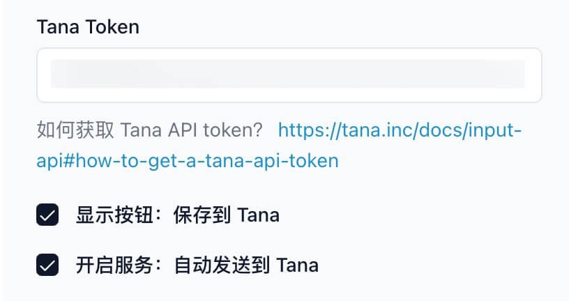 配置同步选项:根据您的需求,选择是否开启“显示按钮:保存到 Tana”或“开启服务:自动发送到 Tana”功能。前者允许您在生成AI总结后手动将其保存到Tana,后者则会自动将总结发送至Tana。