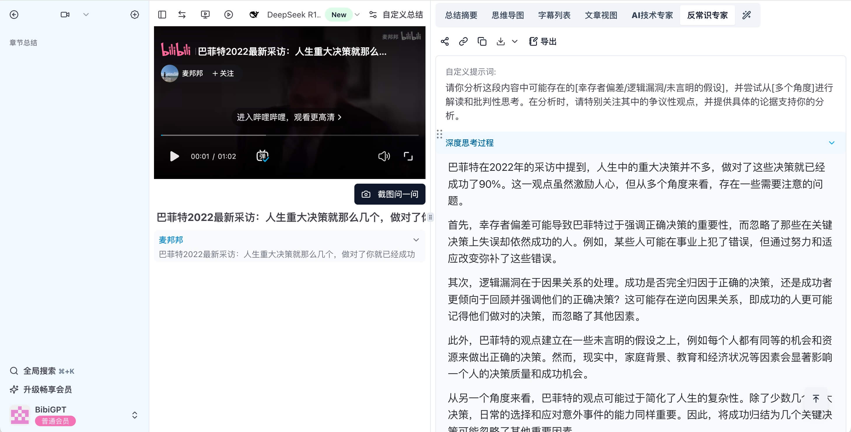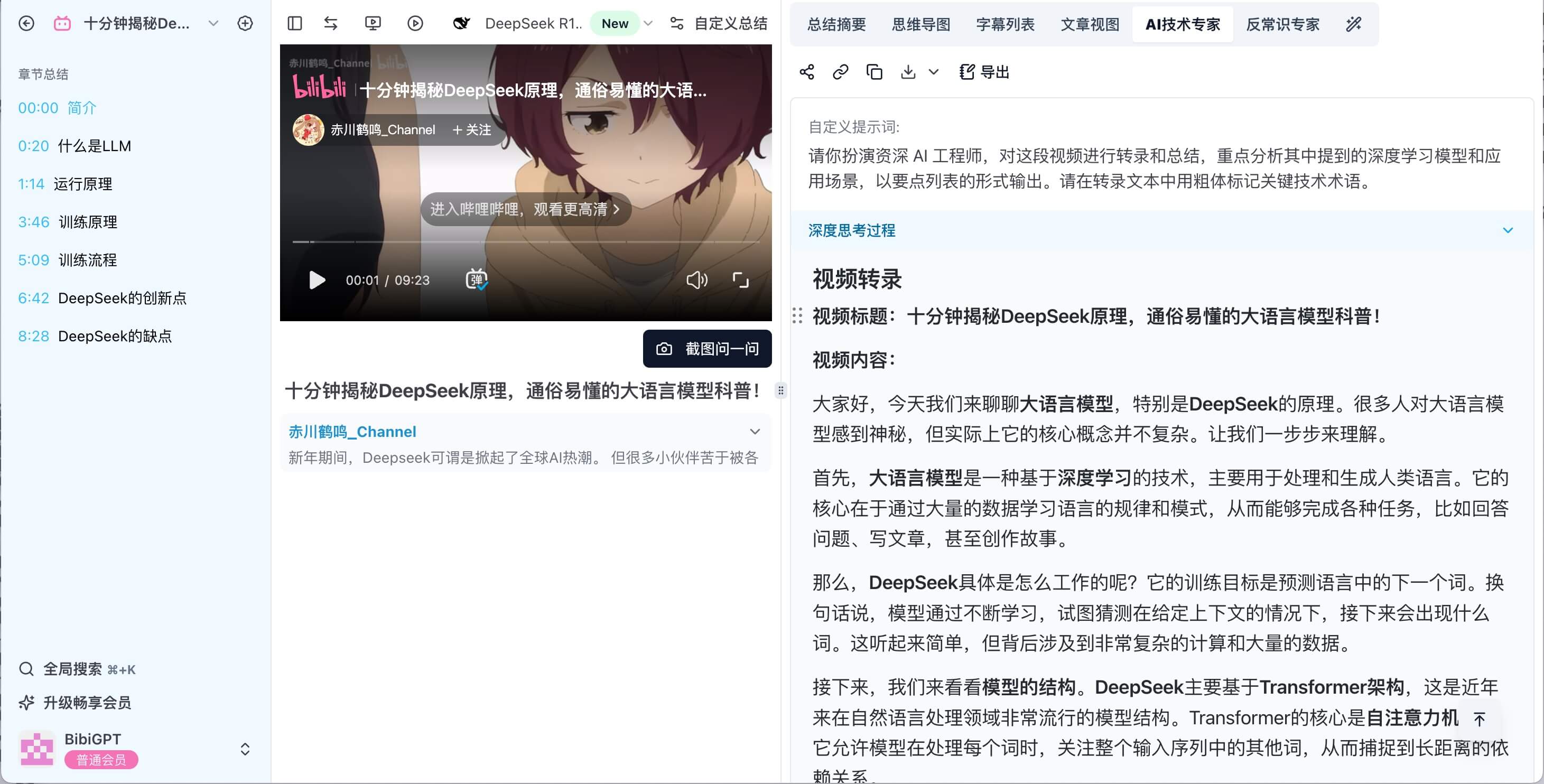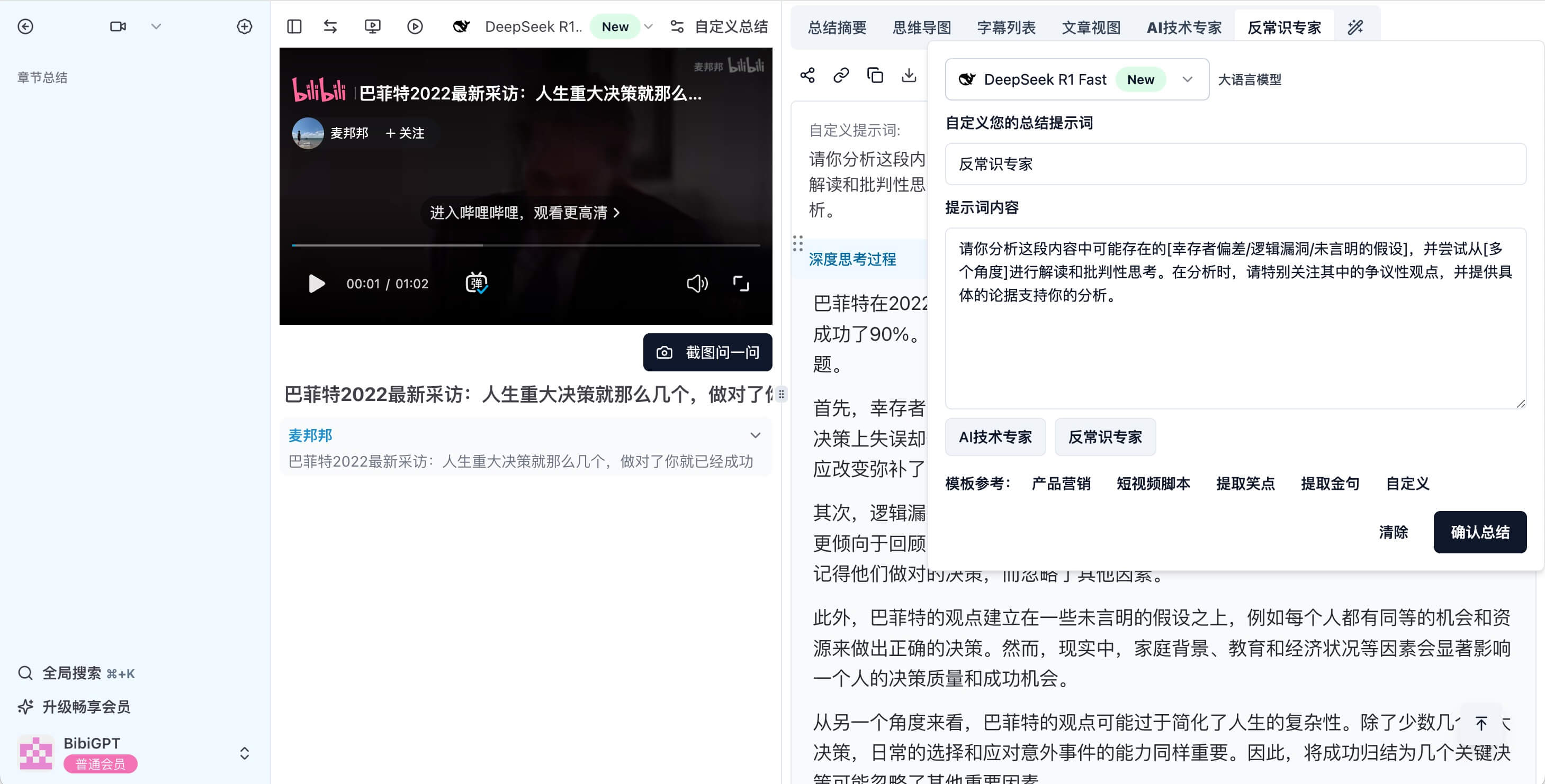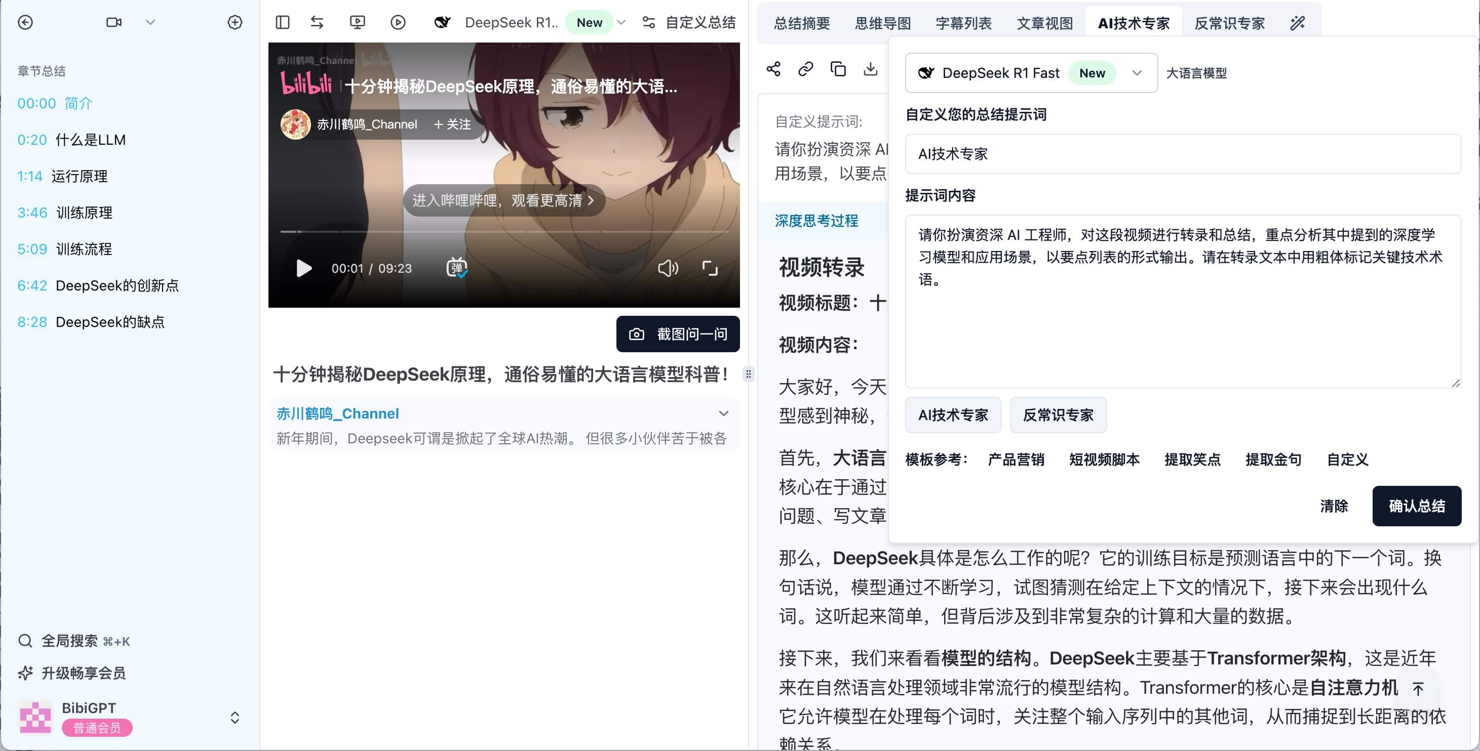 BibiGPT already summarizes content from Bilibili, YouTube, podcasts, meetings, and local files. Its custom prompt feature lets you steer DeepSeek R1’s reasoning—turning raw transcripts into tailored analyses.