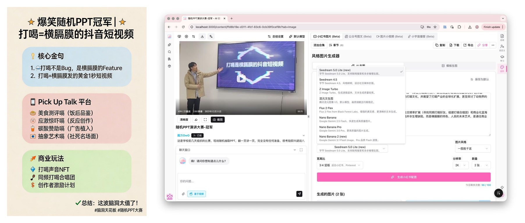 The "Xiaohongshu Images" feature in BibiGPT has gained two new image generation models: Seedream 5.0 Lite (new) and Nano Banana 2 (new). Seedream 5.0 Lite supports web search and multi-step reasoning, helping you generate more coherent and higher-quality visuals. Nano Banana 2 is based on Google Gemini 3.1 Flash Image and focuses on image detail and generation speed. Together, they make it easier to turn video content into eye-catching Xiaohongshu posts.